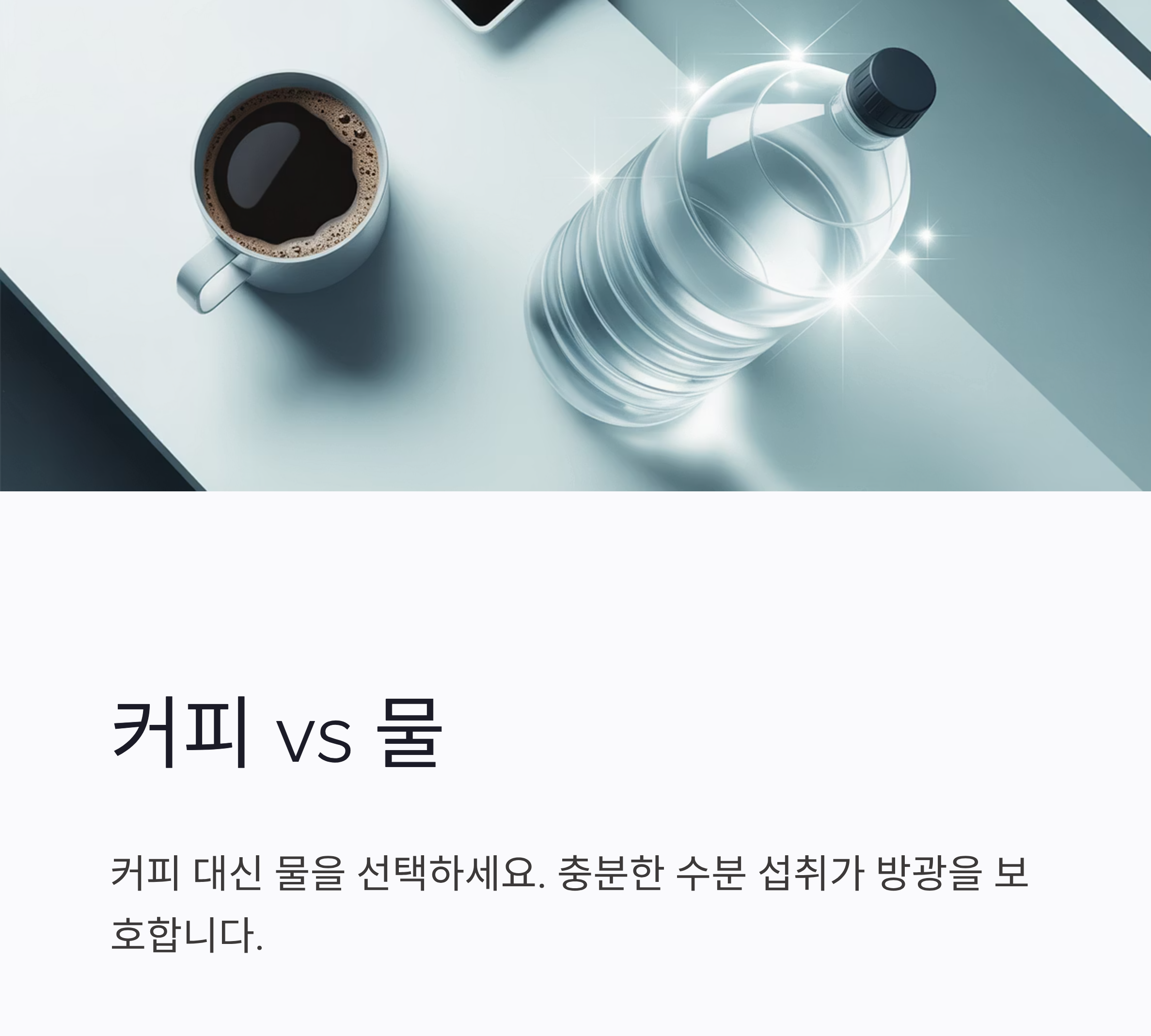 커피 한 잔 마실 때마다 **물 두 잔**을 마셔 **수분 보충**을 병행하세요.