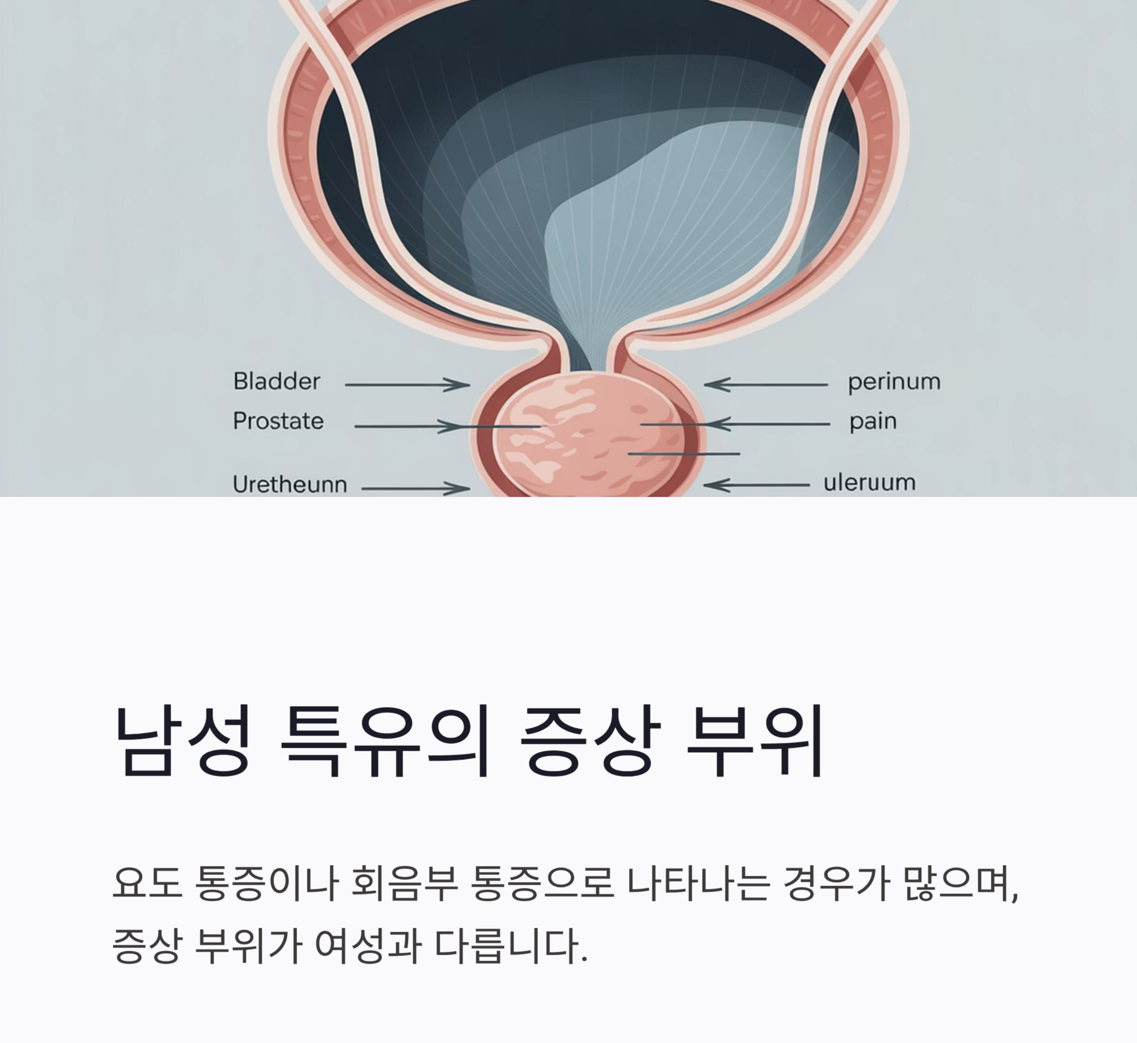 **고환/회음부 통증 동반:** 전립선염이 동반될 경우, 통증이 **고환이나 회음부**로 이어져 방광염 증상으로 인식하지 못할 수 있습니다.