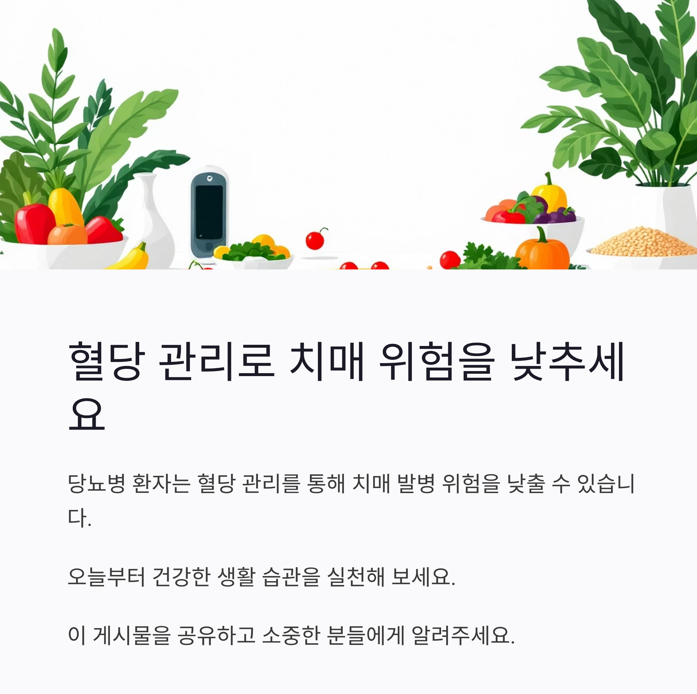우리 모두 건강하고 행복한 노년을 위해 오늘부터라도 혈당 관리와 치매 예방에 더 신경 써보는 건 어떨까요?